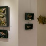 The precious little ladies of laminated glass are subtly engraved in barbed wire. Guerlain centipedes stand alongside the suave scarabs, purple angels and wondering dragonflies are hunted by arrogant Egyptian birds leant against the wall. From the rocks, vertebrae and Saint-Jacques shells, the artist imagined amber beasts, softly wrapped in Buzau net, or, as the case may be, crinoline fluids.